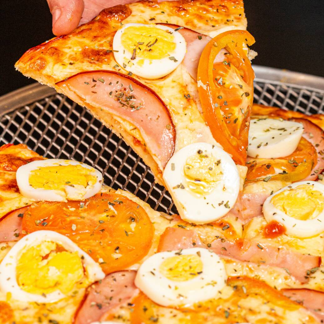Massa fininha, extrato de tomate, Queijo Mussarela, ovos, peito de peru, pitada de orégano, tomate de cebola.