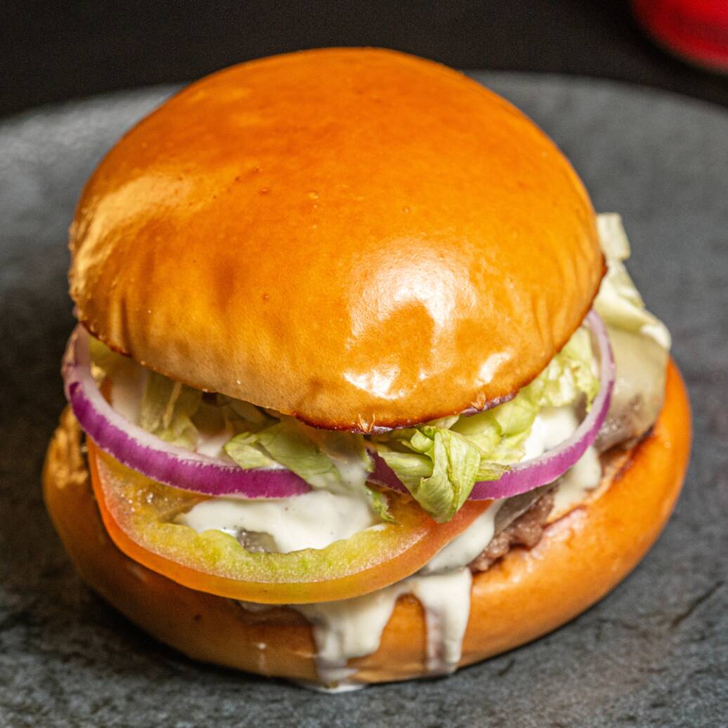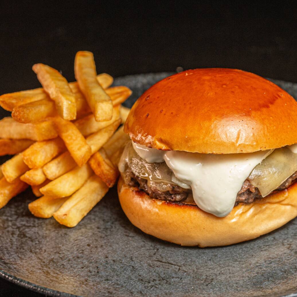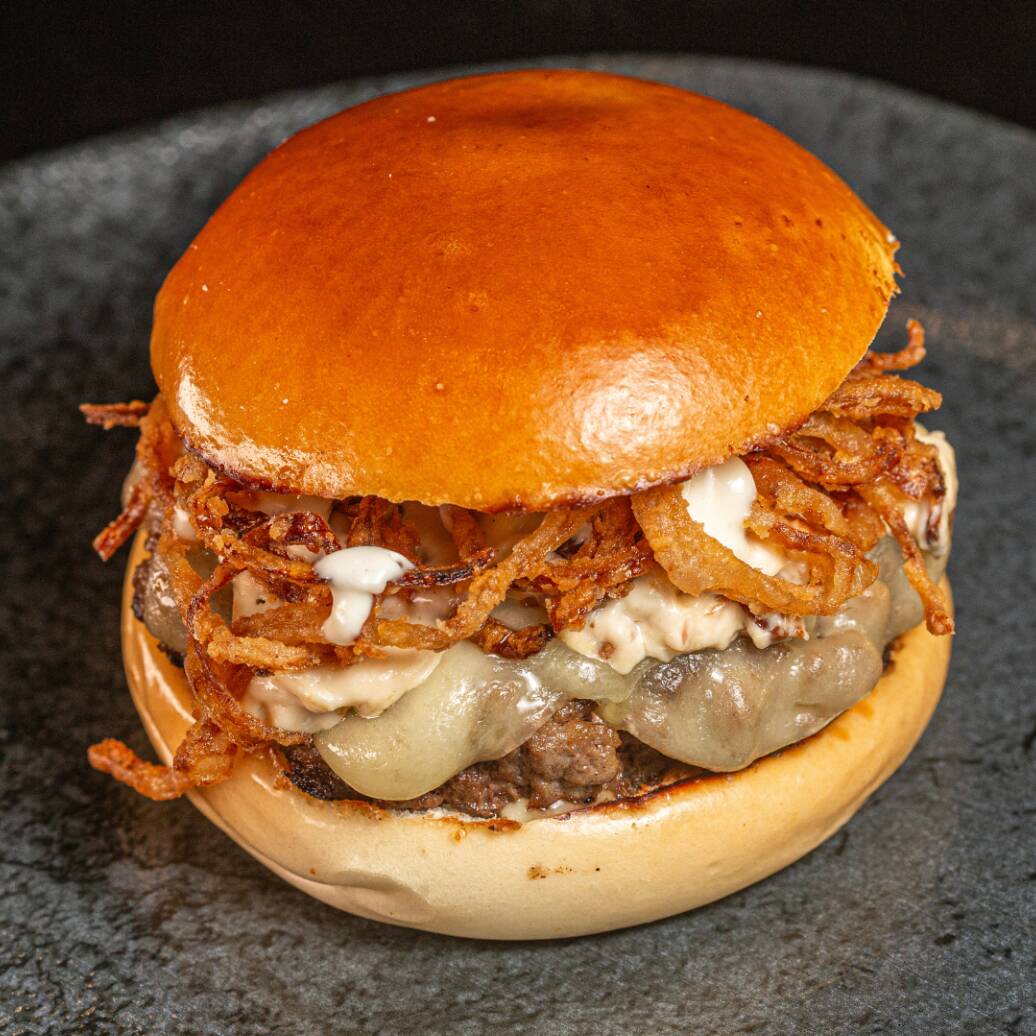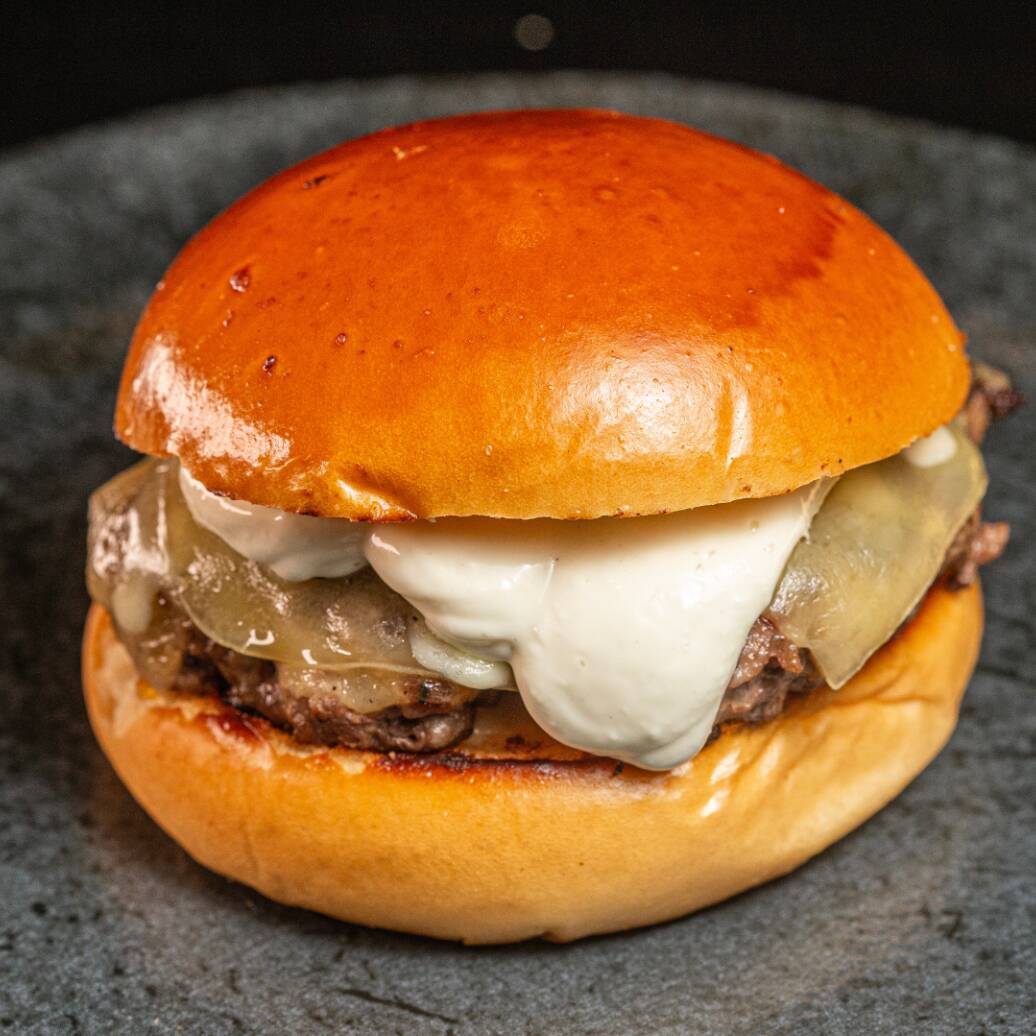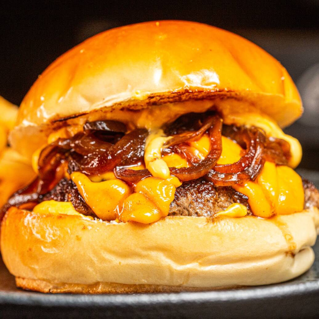 Pãozinho chapeado, carne bovina fininha, cheddar cremoso e cebola caramelizada.
