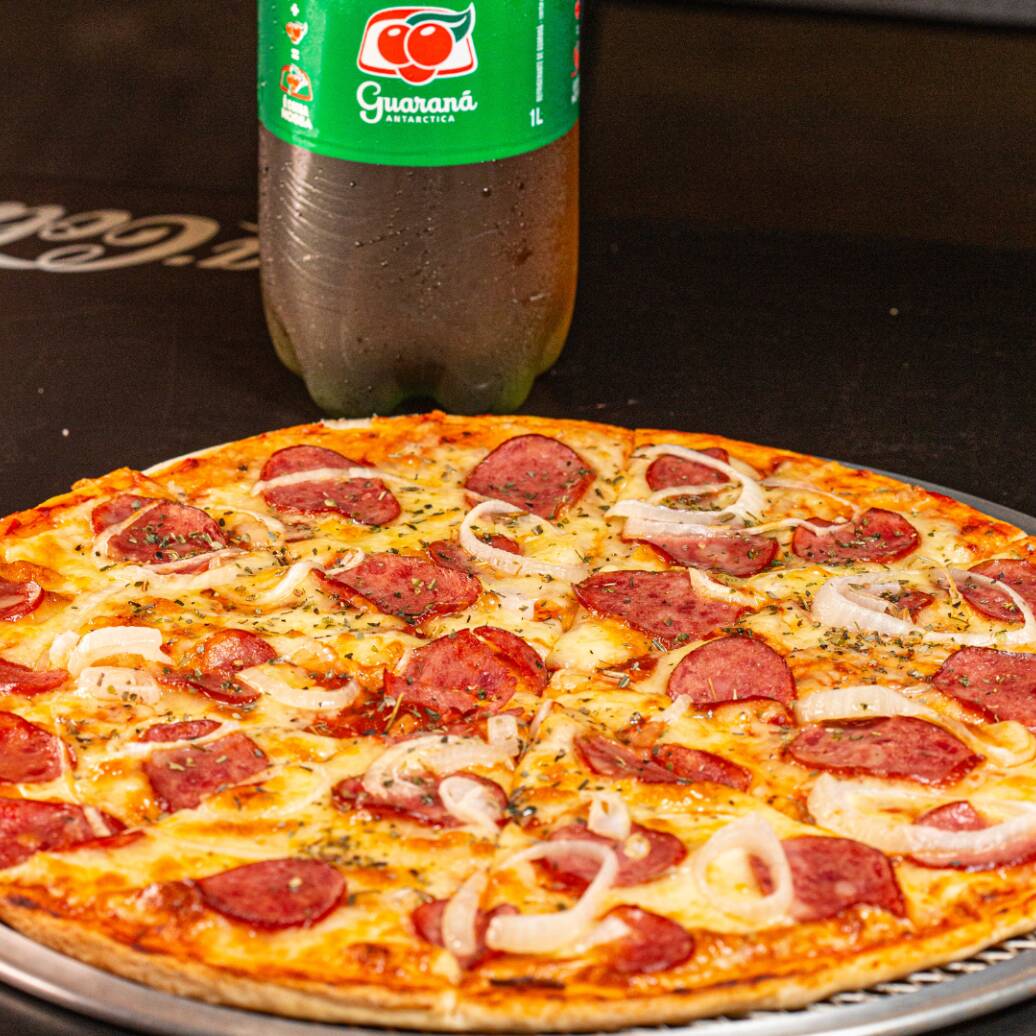 Massa fininha, extrato de tomate, queijo mussarela, calabresa, orégano e cebola. (8 Fatias) + Guaraná 1LT