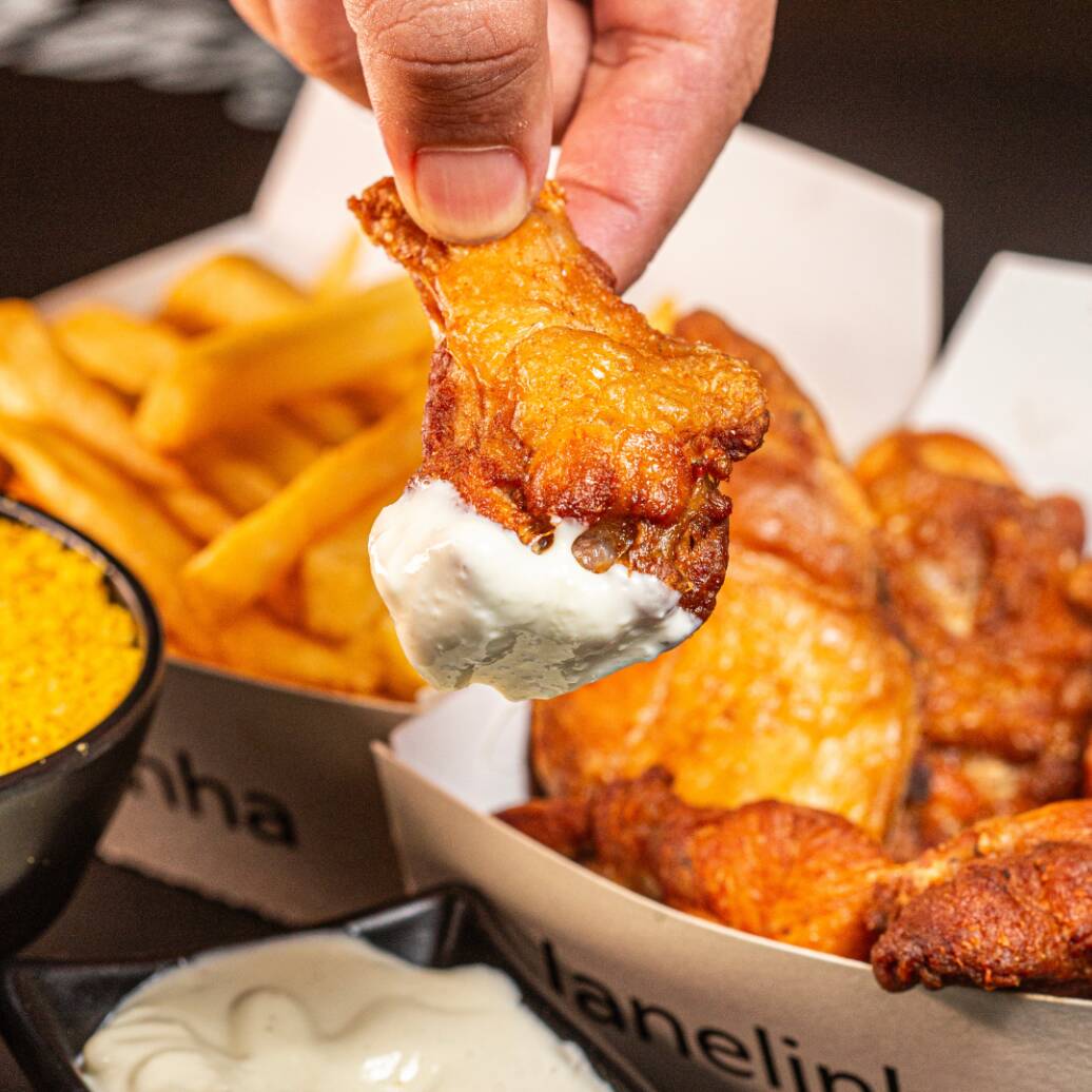 Delicioso frango à passarinho (Aprox. 190g), acompanhadao de batata frita (90g), farofa e molho da casa