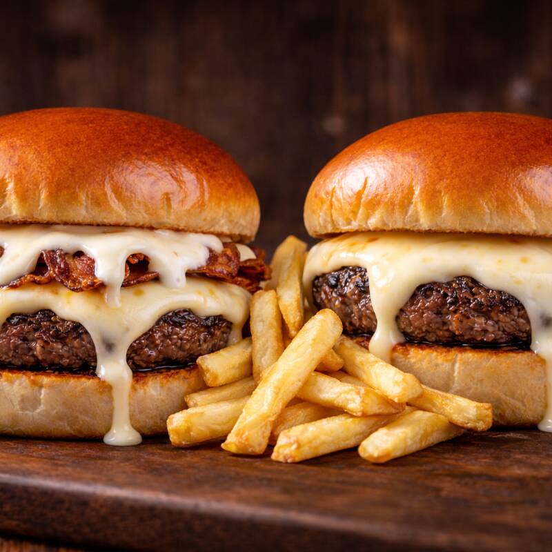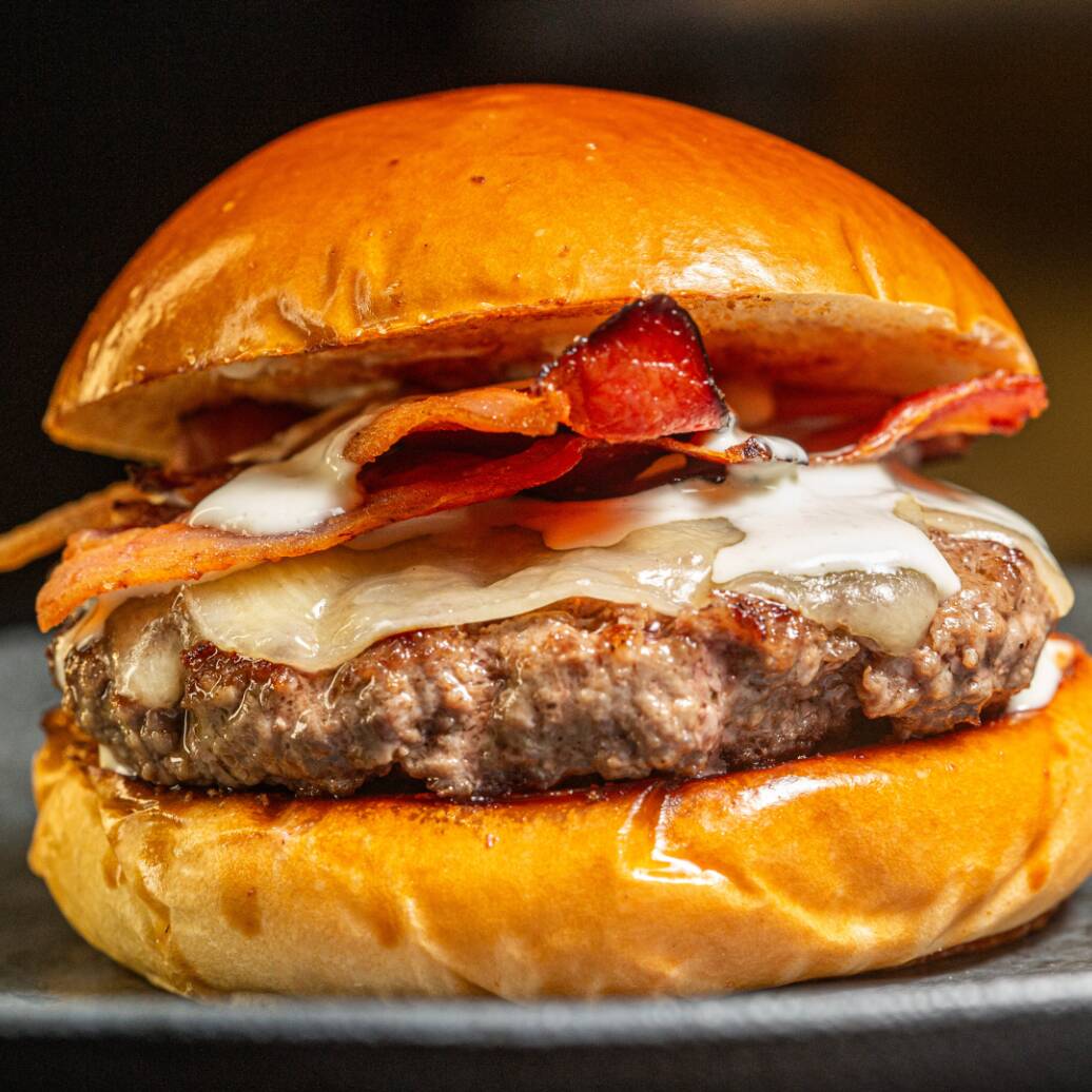 Pãozinho chapeado, carne bovina fininha, creme de queijos e muito bacon douradinho.