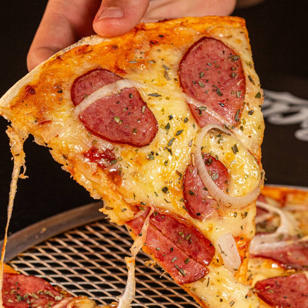 Massa fininha, extrato de tomate, queijo mussarela, calabresa, orégano e cebola. (8 Fatias)