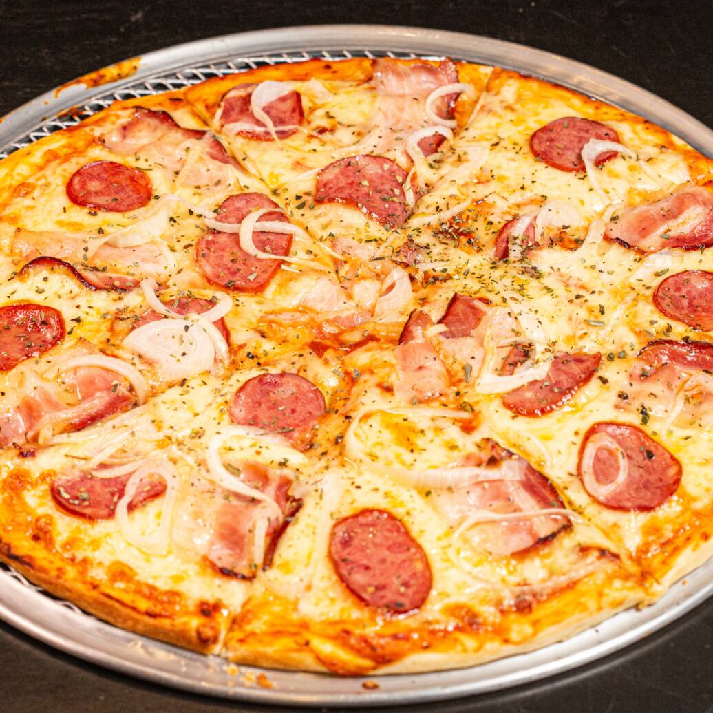 Extrato de tomate, Queijo mussarela, Calabresa fatiada, Bacon fatiado, pitada de orégano, tomate e cebola.