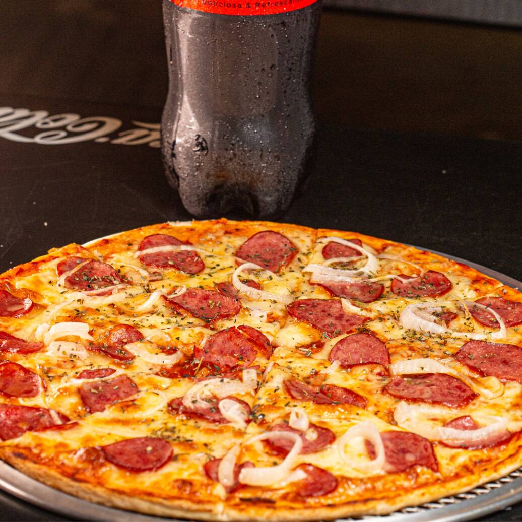 Massa fininha, extrato de tomate, queijo mussarela, calabresa, orégano e cebola. + Coca Cola 1LT
