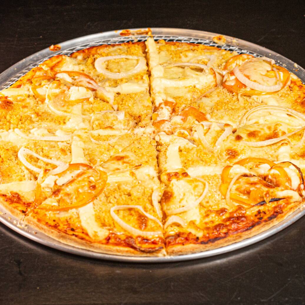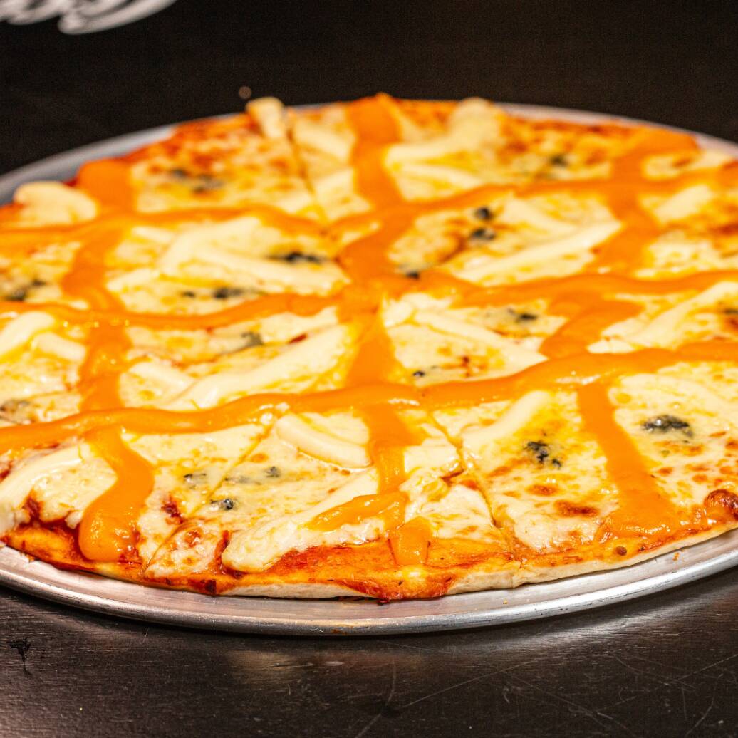 Massa fininha, extrato de tomate, queijo mussarela, gorgonzola, parmesão, catupiry, cheddar e cebola.