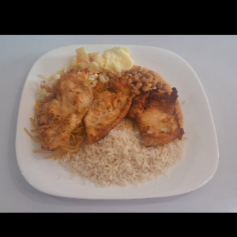Acompanha arroz. Feijão. Macarrão. Salada verde. Salada de maionese.pure de batata. Farofa