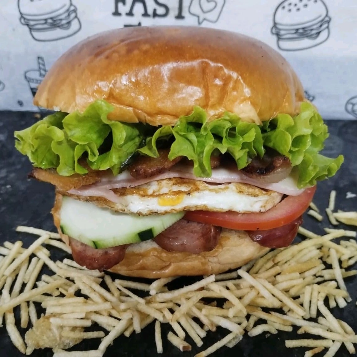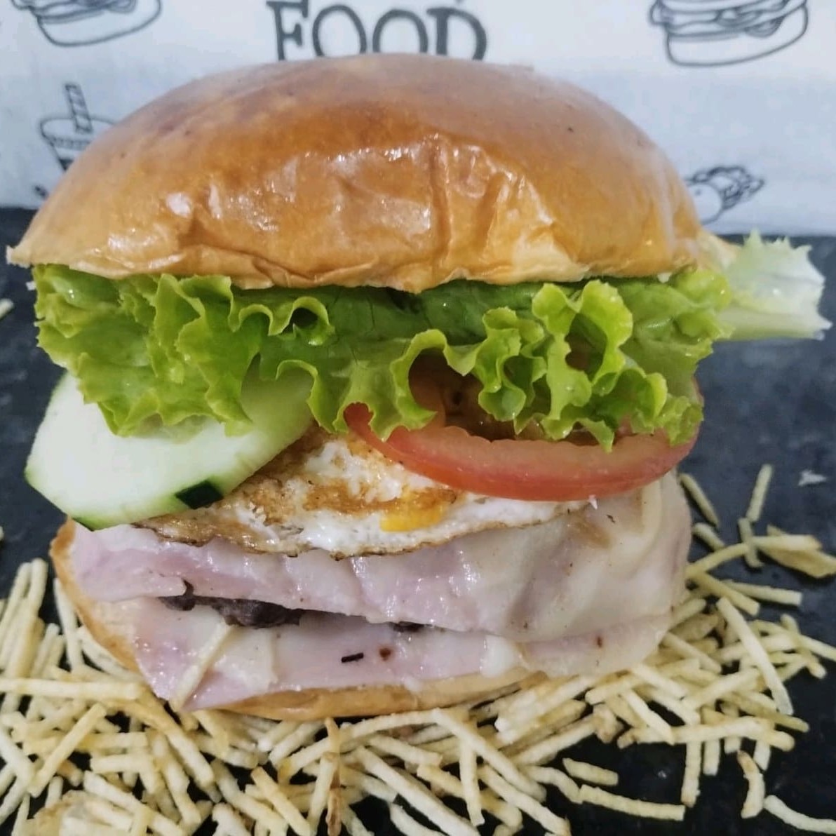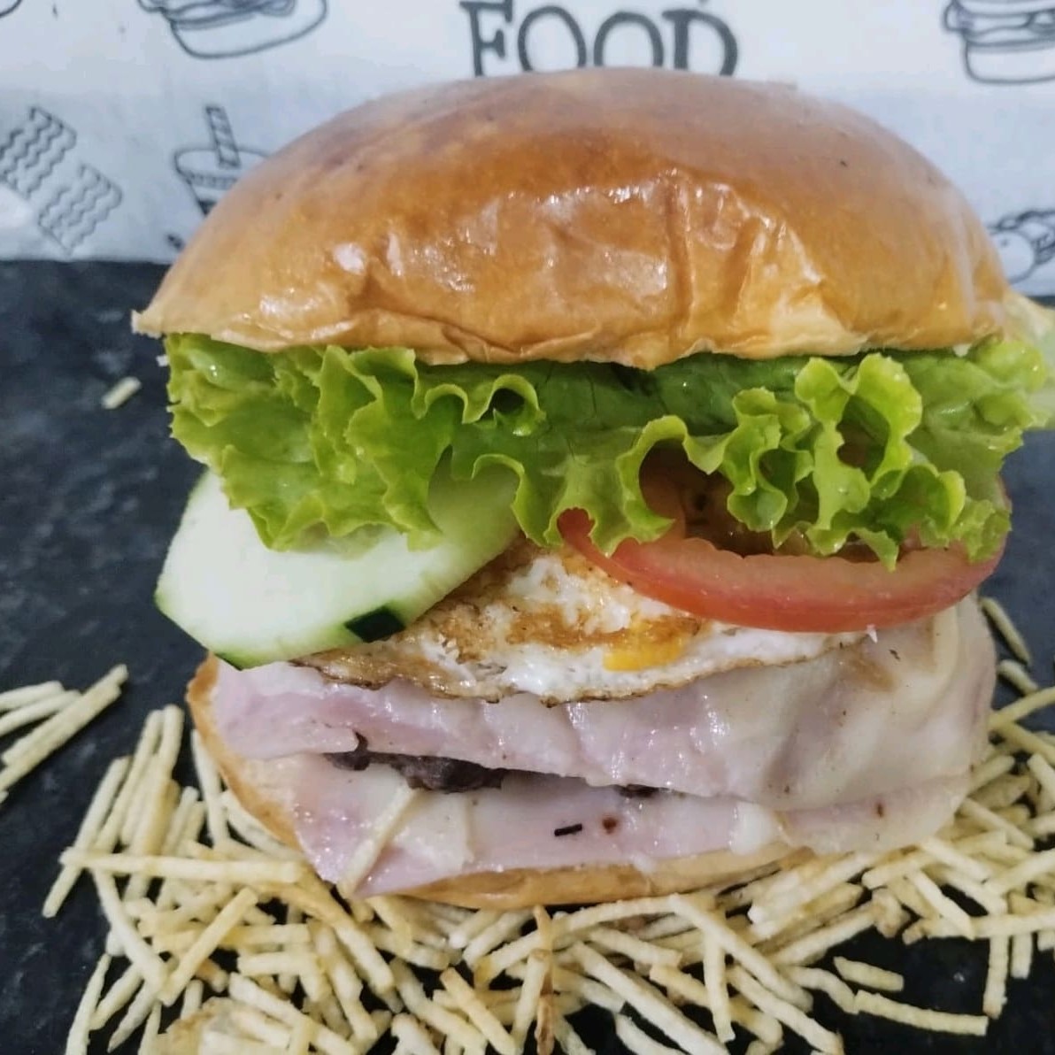 Pão, carne 120gm,ovo, queijo, presunto, salada, batata palha