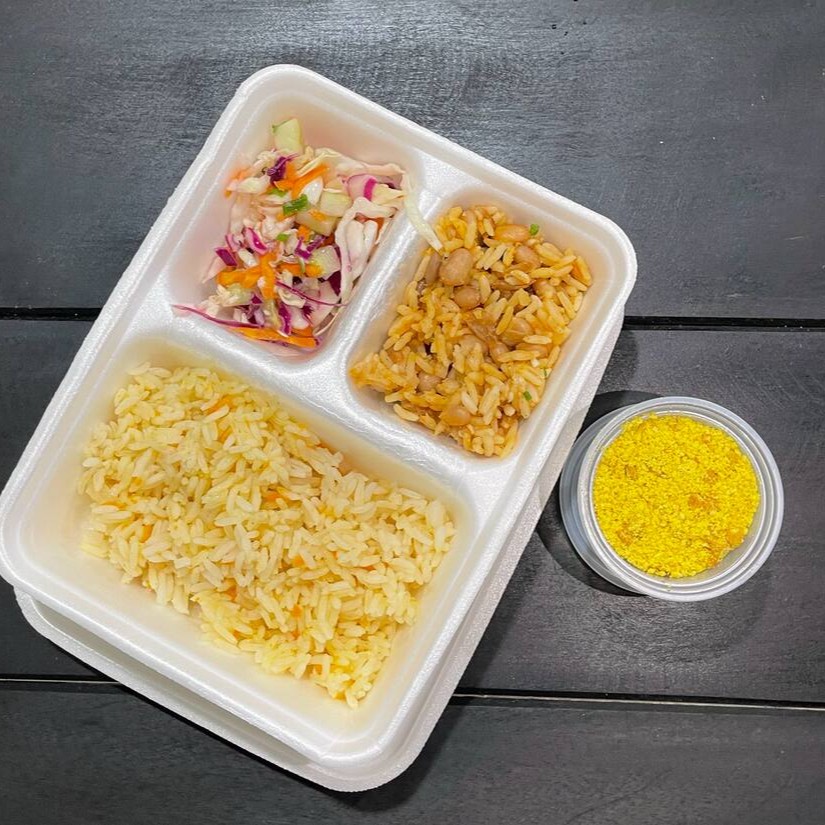 Uma combinação irresistível de sabores: o tradicional Baião de Dois, preparado com arroz, feijão verde e Calabresa; acompanhado de uma farofa dourada e crocante; arroz branco soltinho e um vinagrete delicioso.