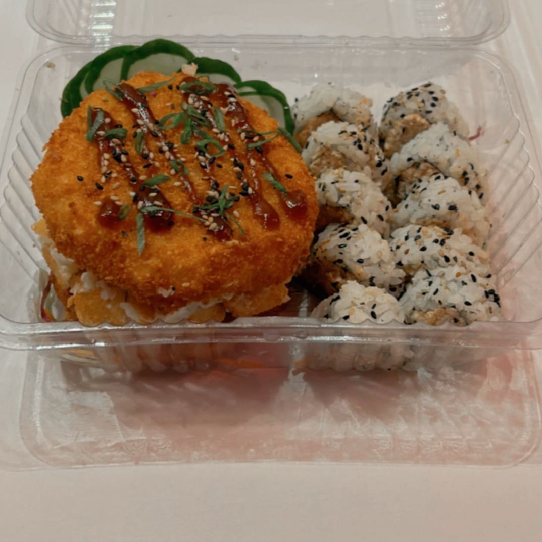Promo 03: 01 sushi burguer de salmão empanado + 10 uramaki de salmão grelhado.