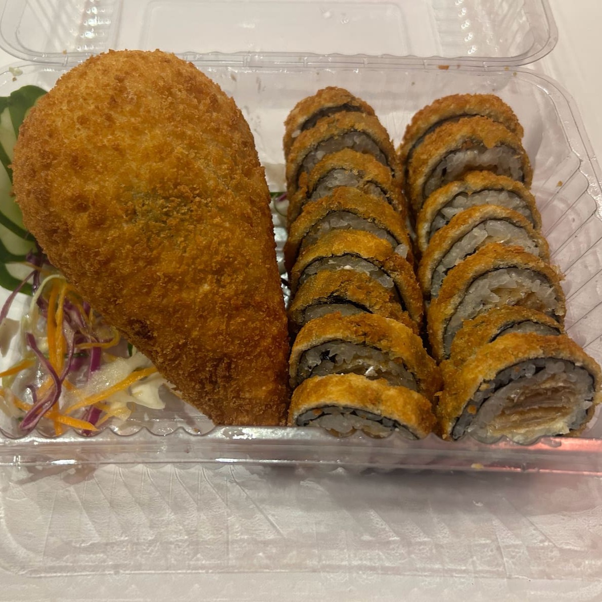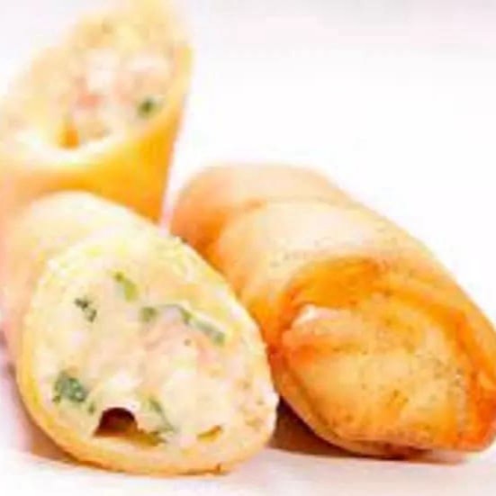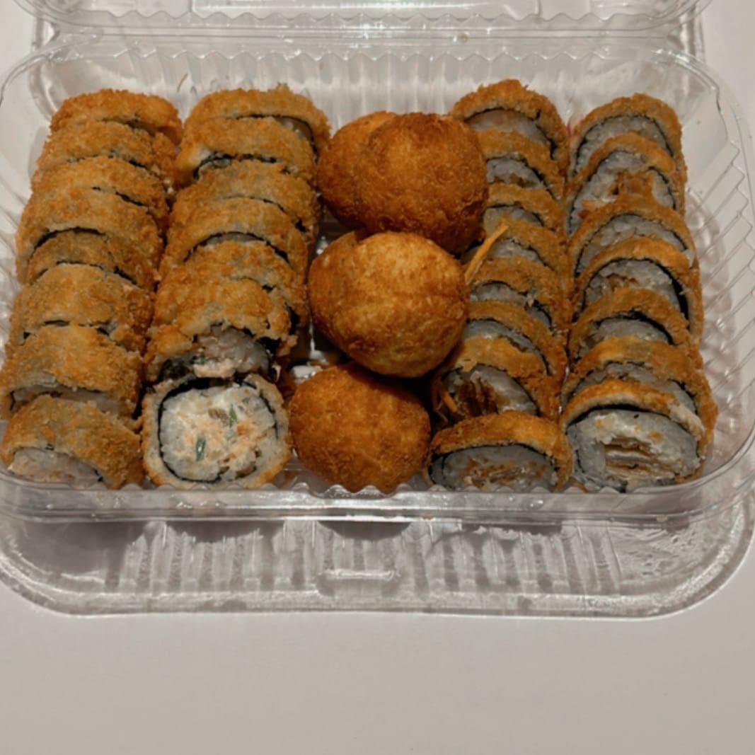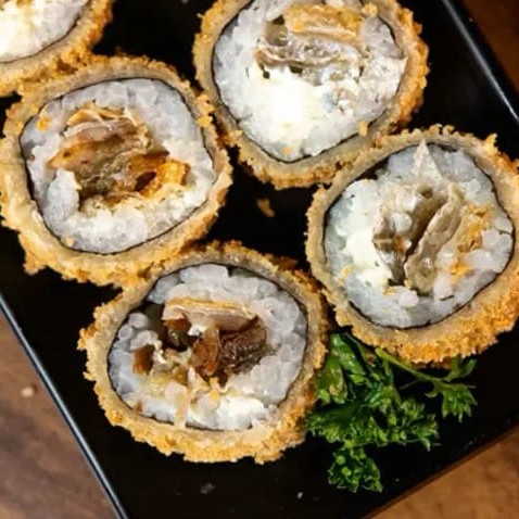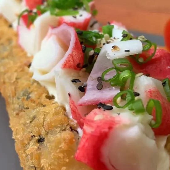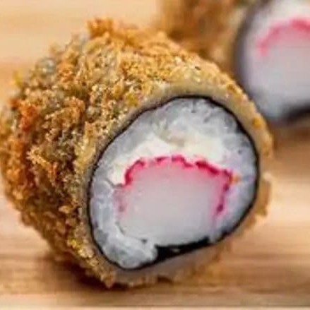 Saboroso prato: (Enrolado de arroz japonês, cream cheese com recheio de Kani Kama), empanado e frito.