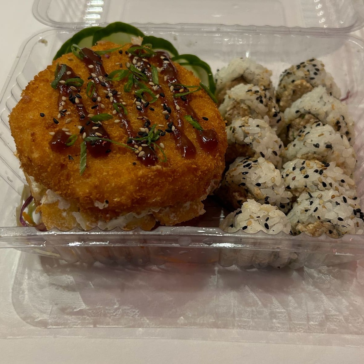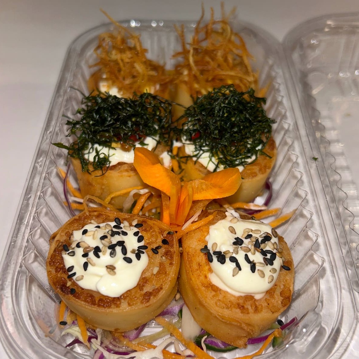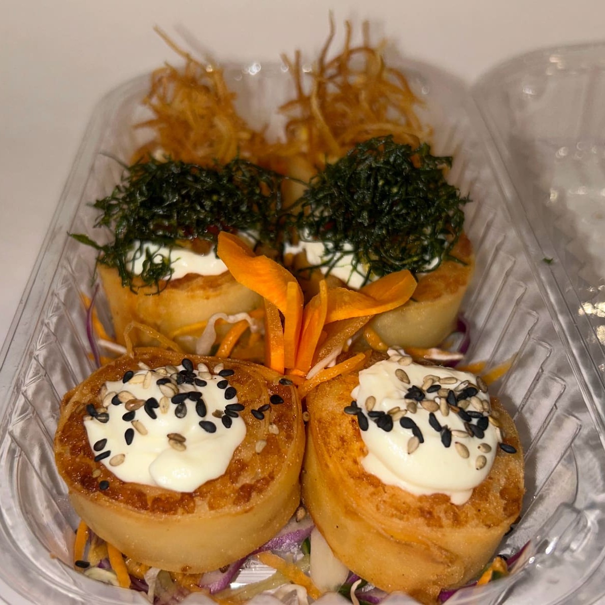 Saboroso prato: (Enrolado de arroz japonês, cream cheese com recheio de Kani Kama), empanado e frito.