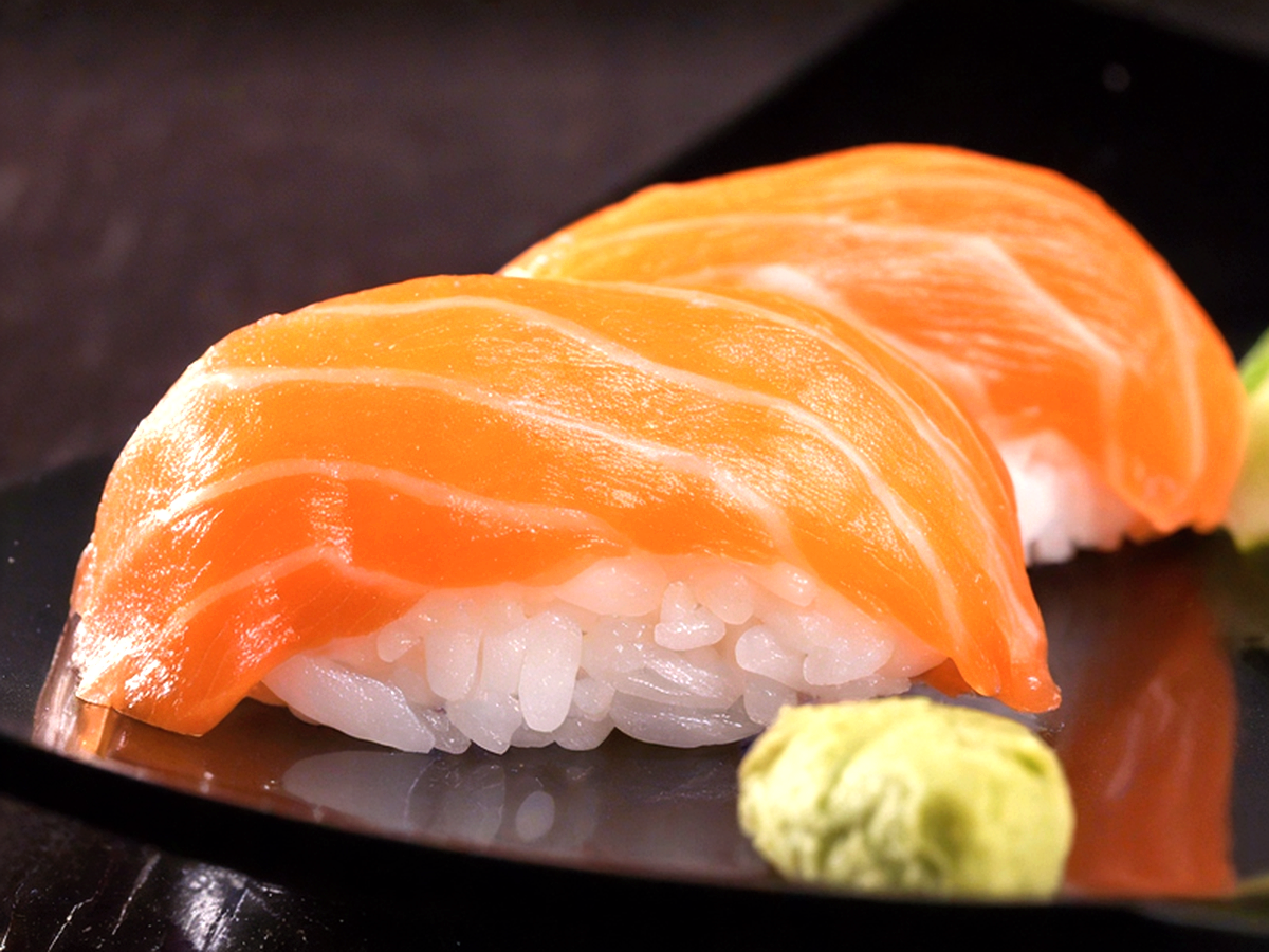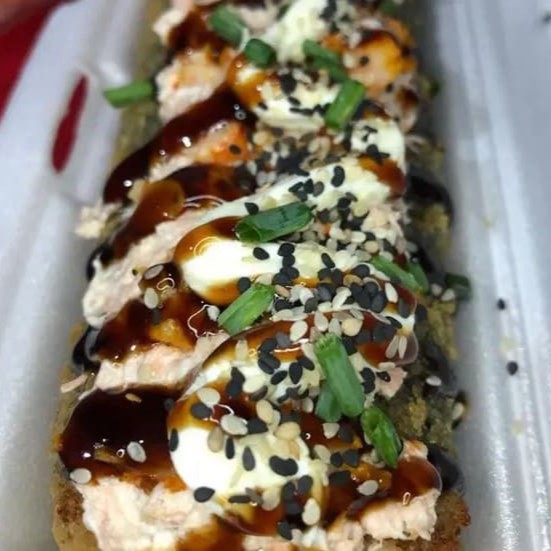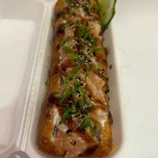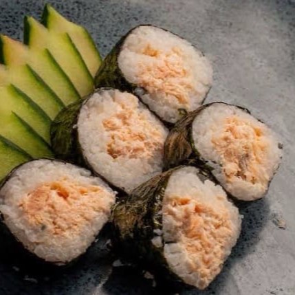 Saboroso Enrolado de Arroz japonês, cream cheese, super recheado e coberto de salmão. Finalizado com molho tarê e cebolinha.