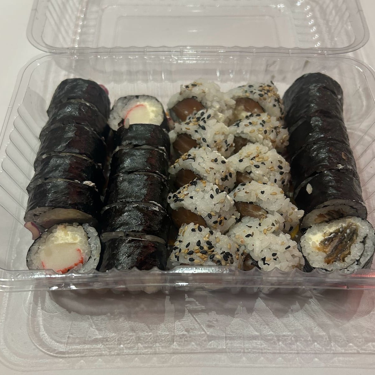 7 hot camarão, 5 uramaki salmão grelhado, 6 hossomaki kani, 4 niguiri salmão