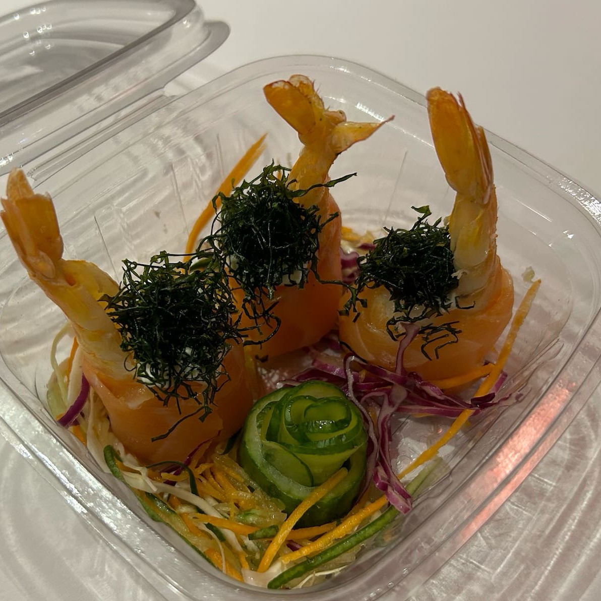 Camarão Delicioso combinado de legumes e frutas com proteínas) Compõe: base de arroz, sunomono, manga, cream cheese, camarão, gergelim, finos talos de cenoura e crispy especial de couve ou batata doce.