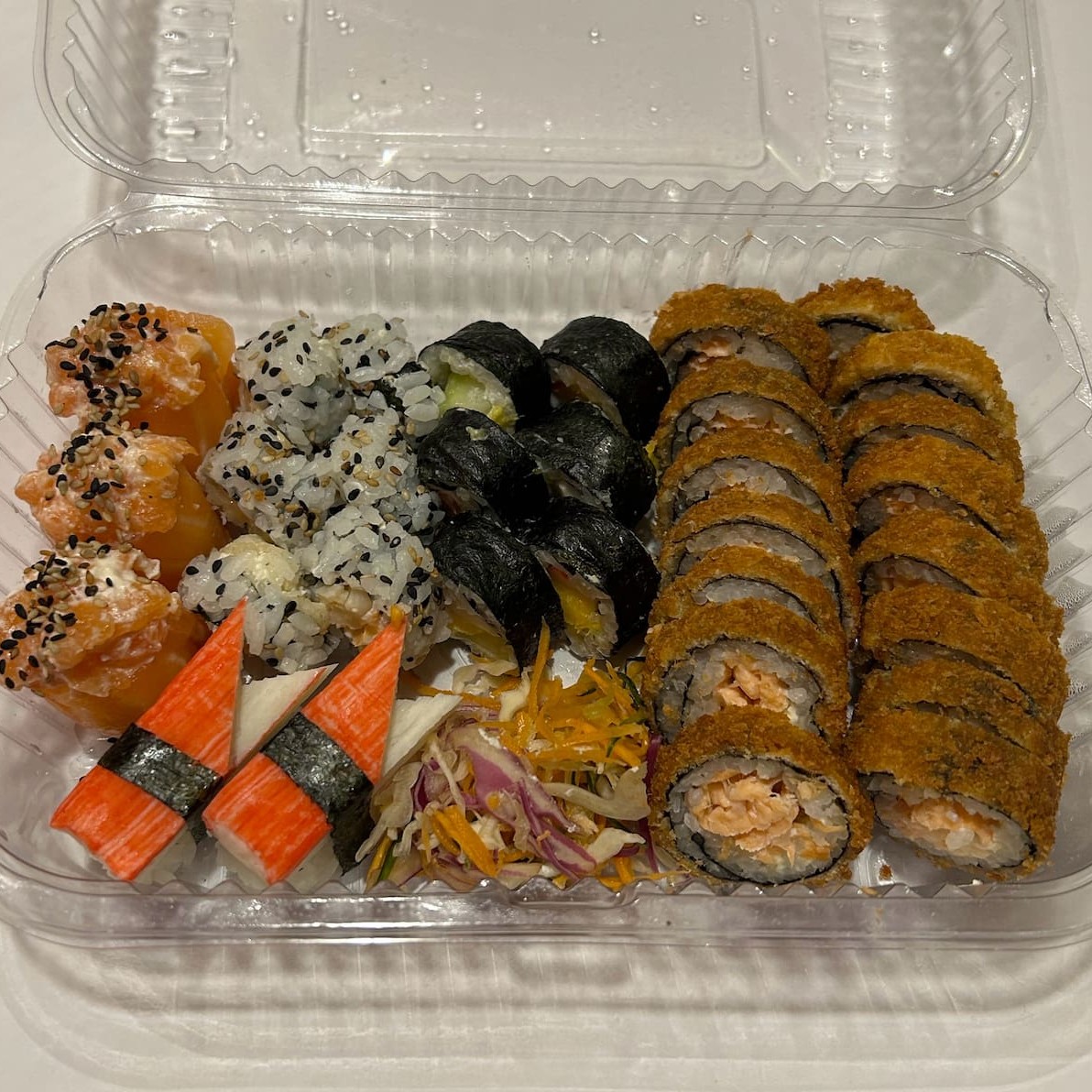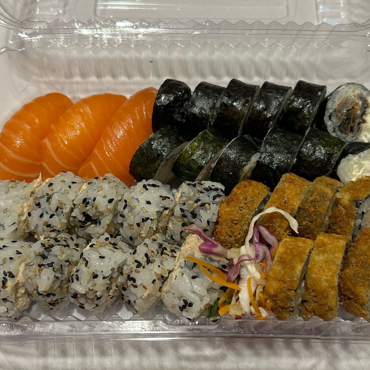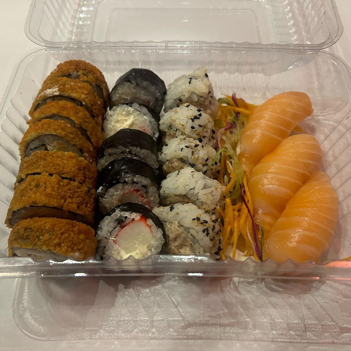 15 hot salmão, 06 hossomaki Califórnia + 5 uramaki camarão + 3 Gunkan tradicional + 2 niguiri de kani.
