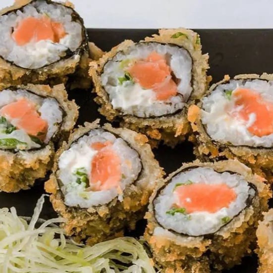 Saboroso prato: Enrolado de arroz japonês, cream cheese com recheio de salmão), empanado e frito..