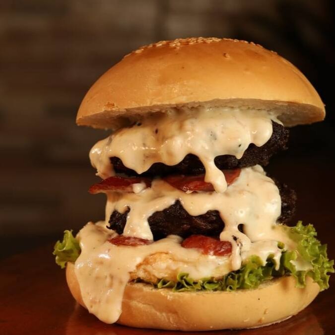Pão, carne 150g, queijo mussarela, salada, ovo, calabresa, bacon, toscana, disco de queijo, molho branco dentro