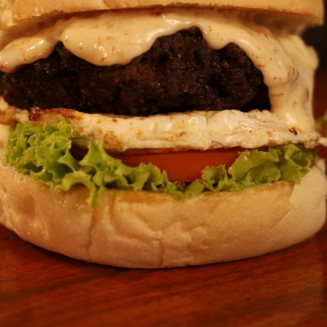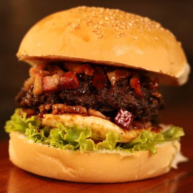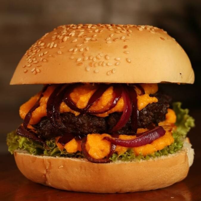 Pão, carne 150g, salada, ovo, cheddar, cebola roxa grelhada