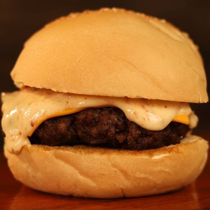 Pão, carne 150g, queijo mussarela, molho branco dentro.
