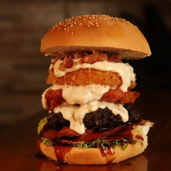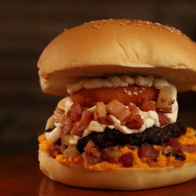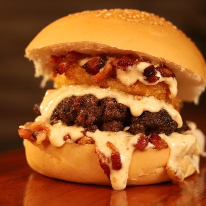 Pão, carne 150g, bacon, queijo chegar, cebola empanada, creme cheese