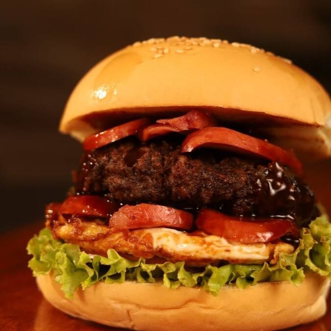 Pão, carne 150g, salada, ovo, queijo mussarela, bacon, molho barbecue dentro