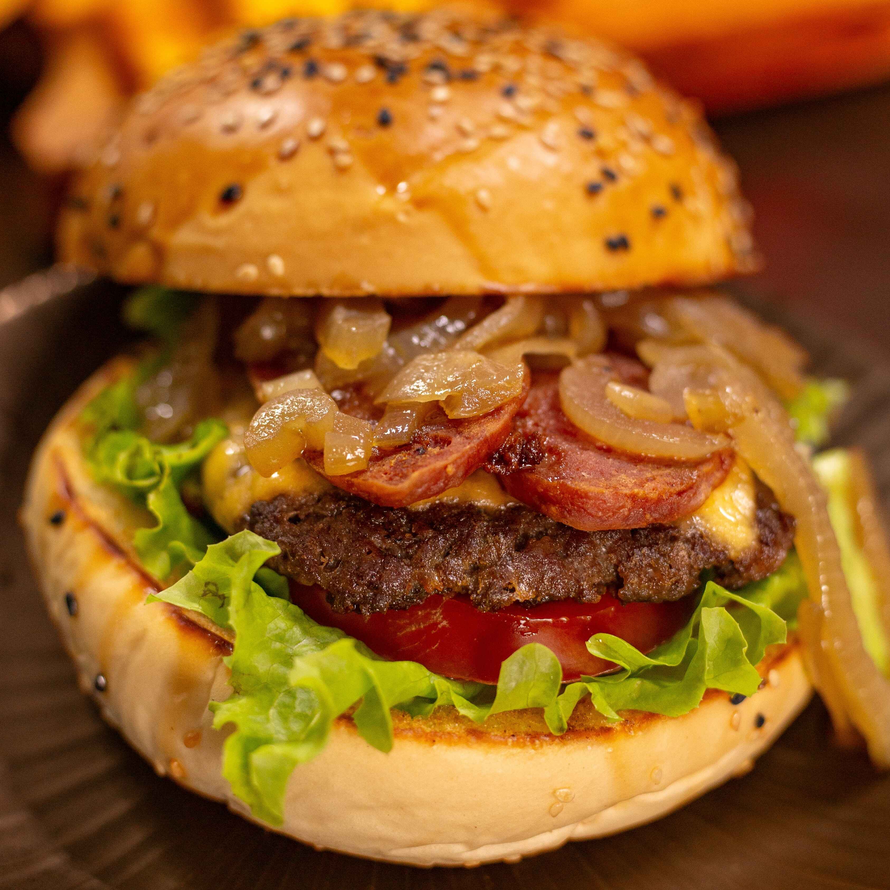 Pão com gergelim, blend bovino 75g na chapa, queijo prato, calabresa, alface, tomate e cebola caramelizada.