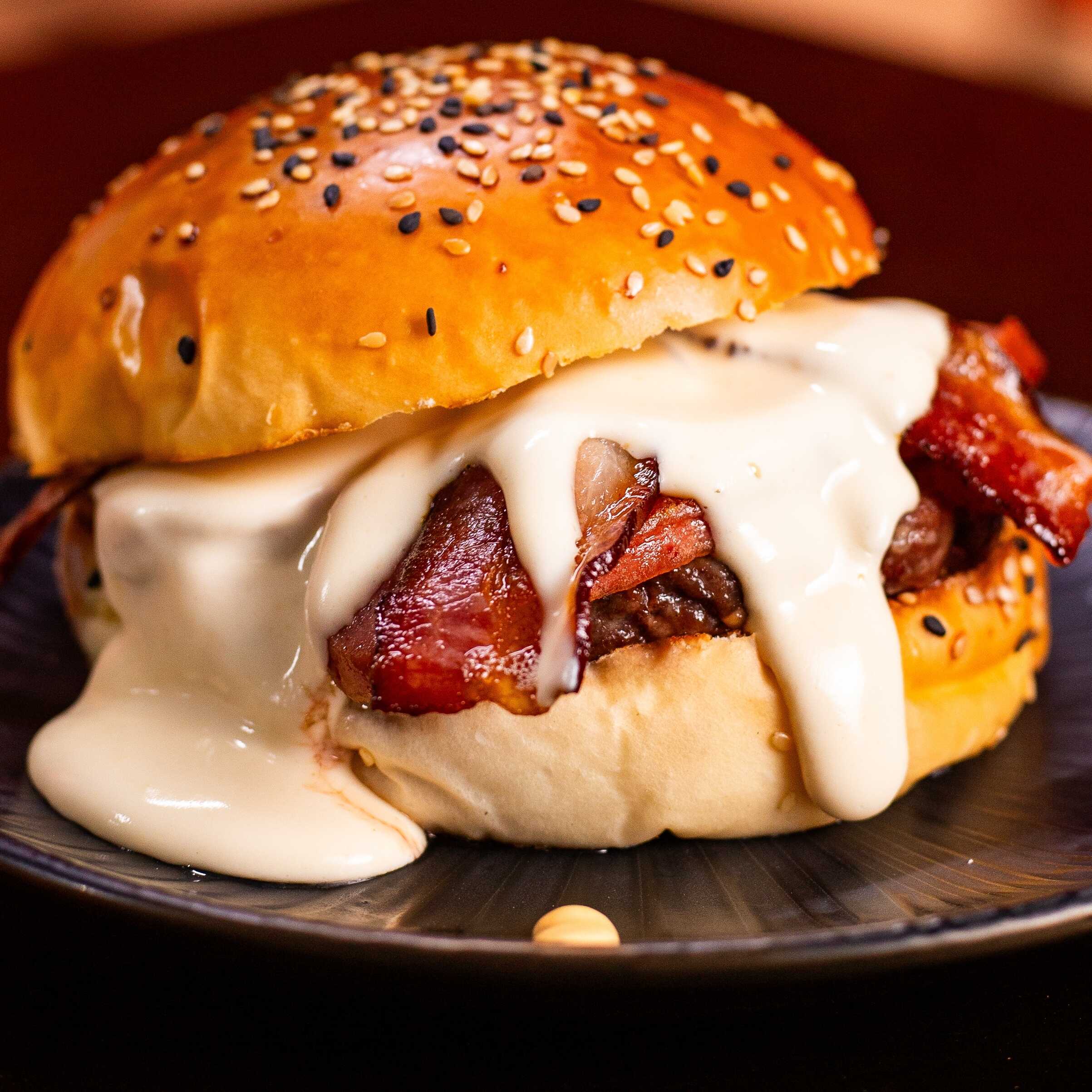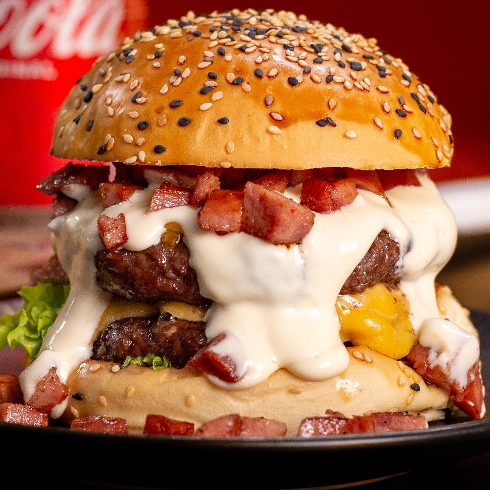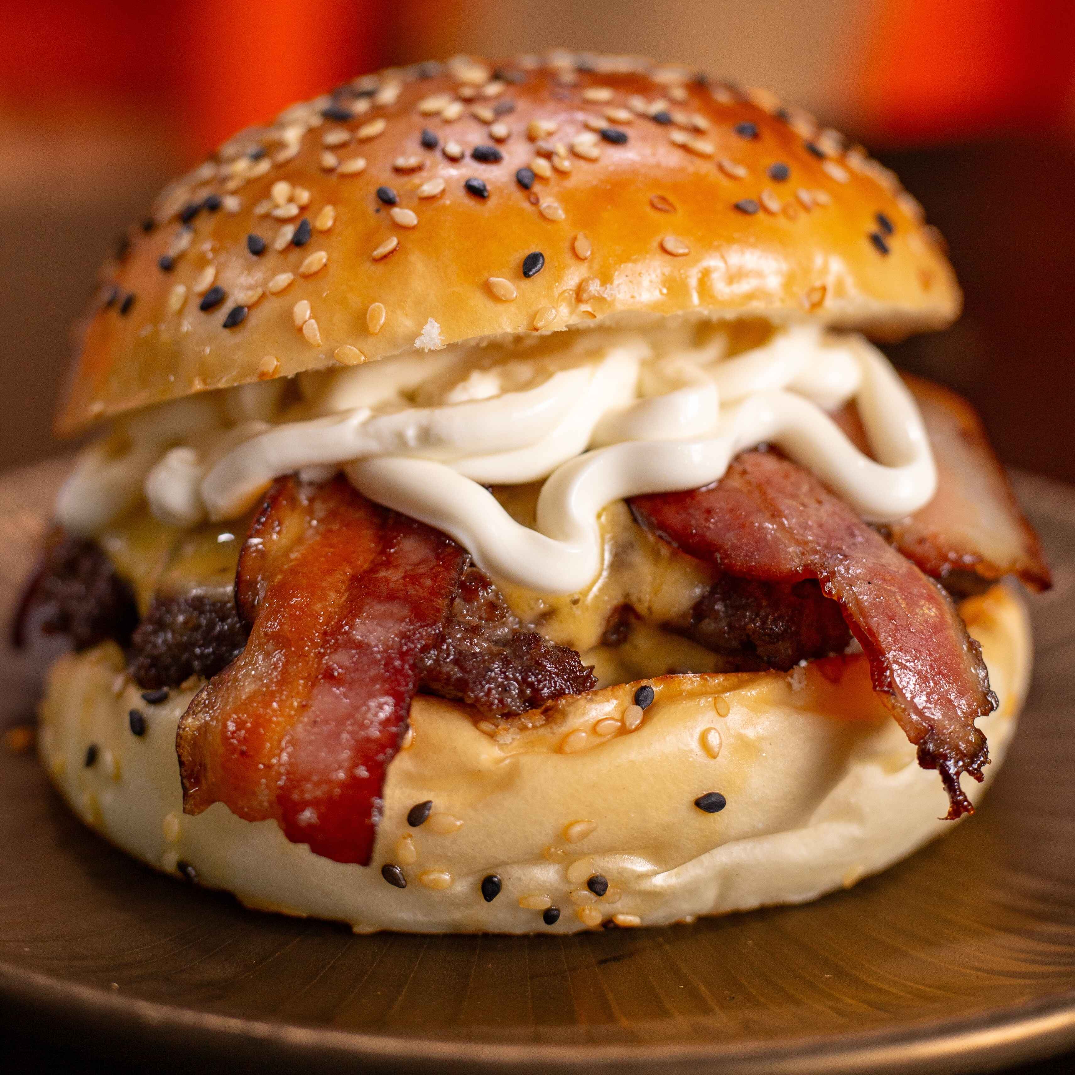 Pão com gergelim, 2x blend bovino 75g na chapa, 2x queijo prato, bacon e cream cheese