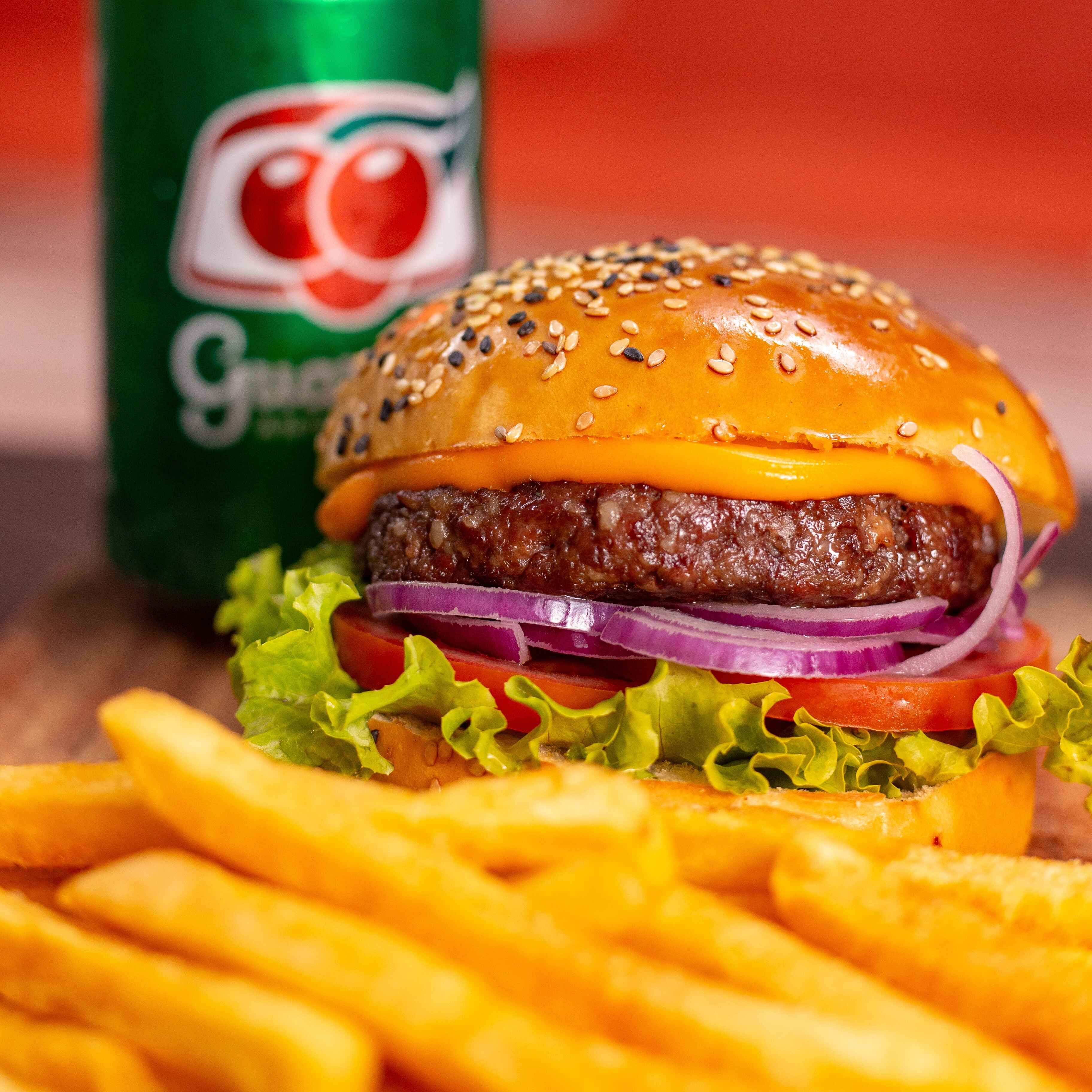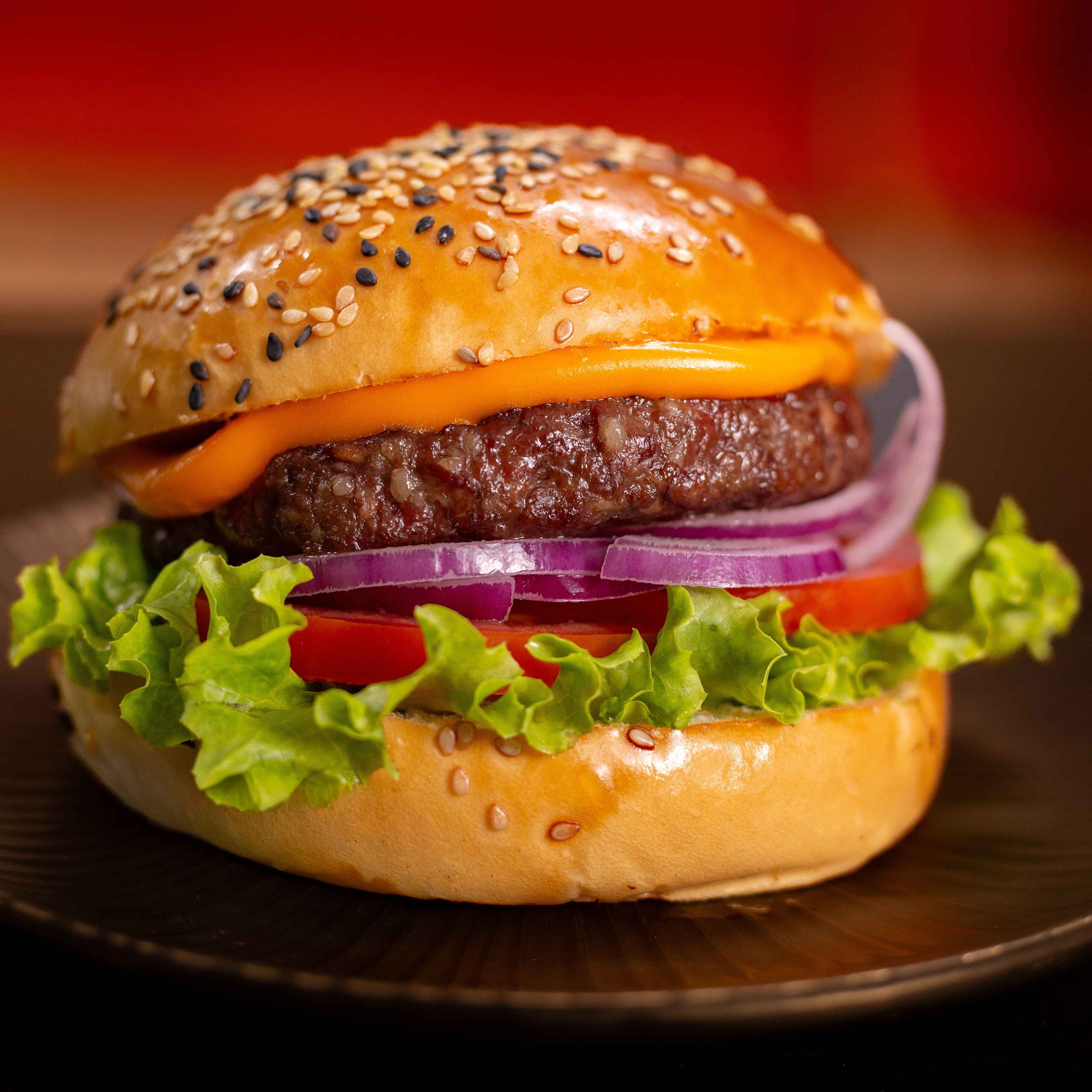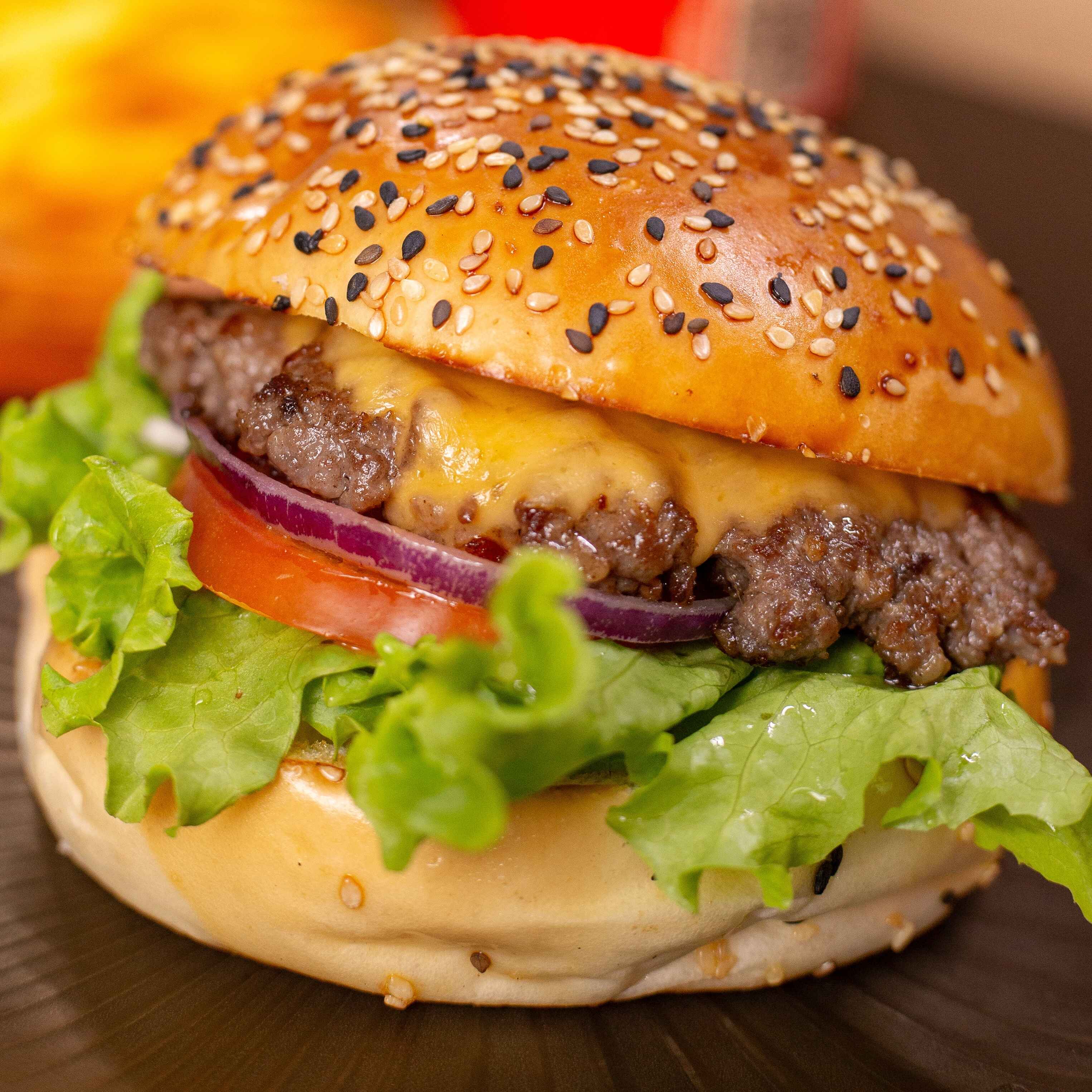 Pão com gergelim, blend bovino 75g na chapa, queijo prato, alface, tomate e cebola roxa.