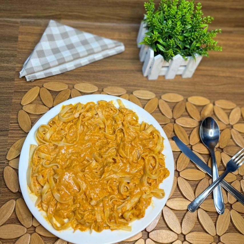 Clássico strogonoff de frango com molho cremoso de creme de leite, servido com arroz e batata palha.