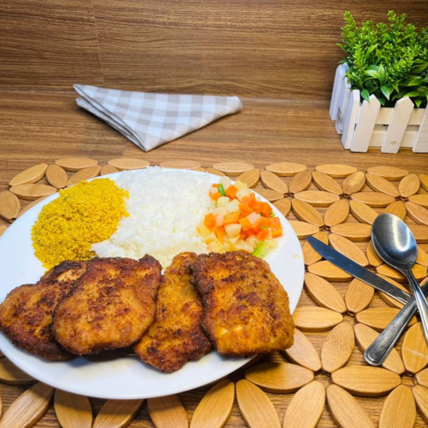 Acomp: arroz, farofa e salada. (Calabresa, carne e frango