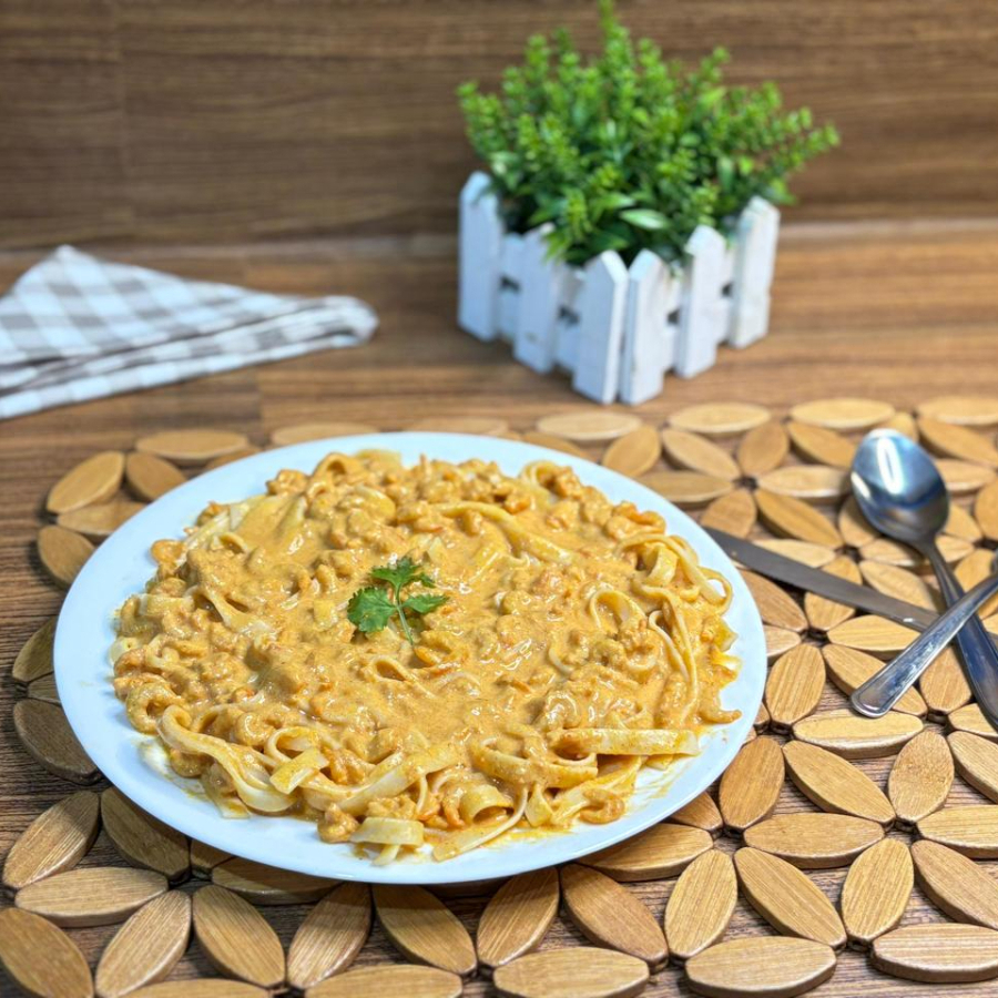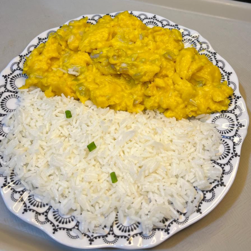 Cubos de carne em um delicioso molho de estrogonofe, servidos com arroz e batata palha.