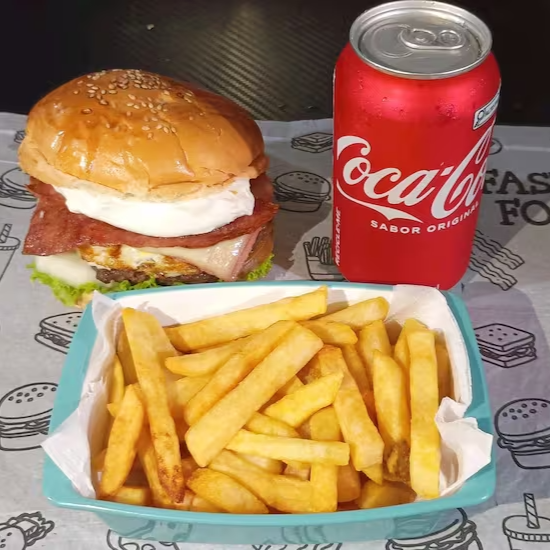 1 hamburguer especial uma poção de batata e uma coca em lata 350ml