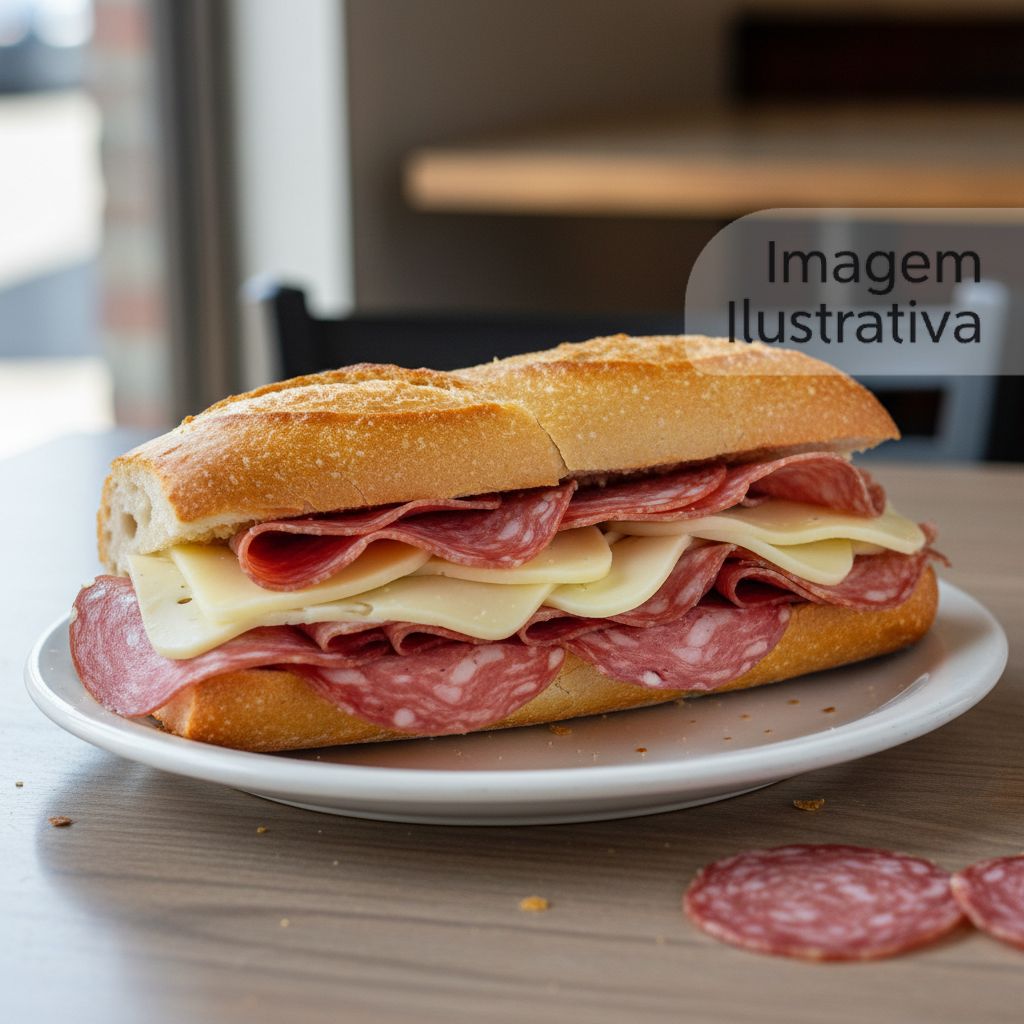 Sanduíche saboroso com pão bola, charque, queijo, presunto, salada fresca e batata palha crocante.