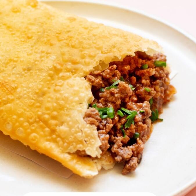 Pastel de carne, recheado com carne bem temperada e massa crocante, perfeito para um lanche rápido.