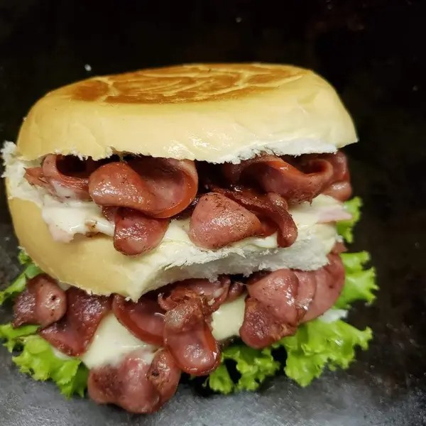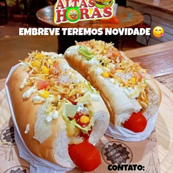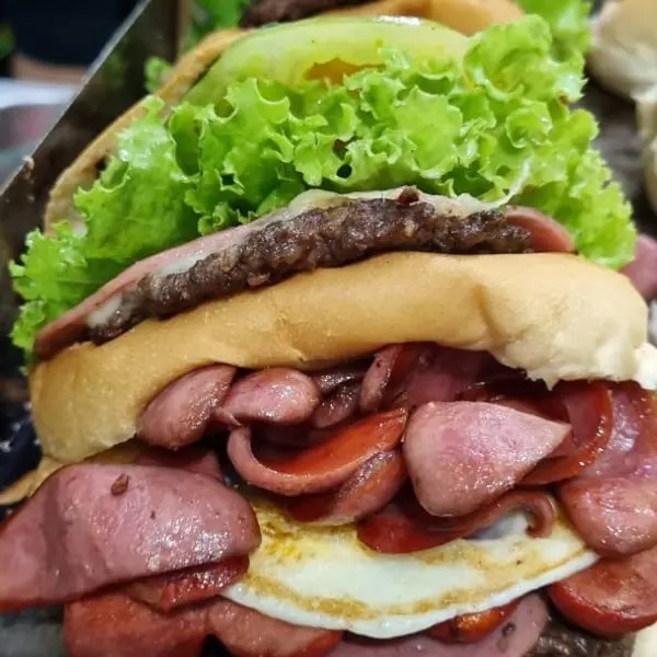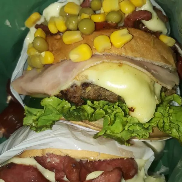 Pão bola, carne de hamburg, 2 queijo, presunto, calabresa dupla camada, alface, tomate, pepino, creme de repolho com maionese caseira, batata palha