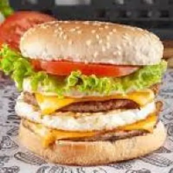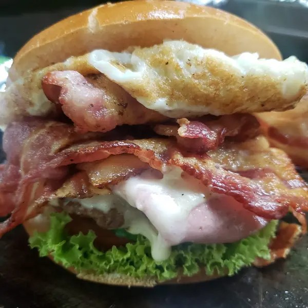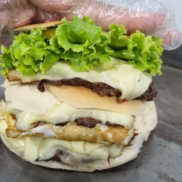 Pão bola, 2 carne, 2 queijo, ovo, alface, tomate, pepino, creme de repolho com maionese caseira, batata palha