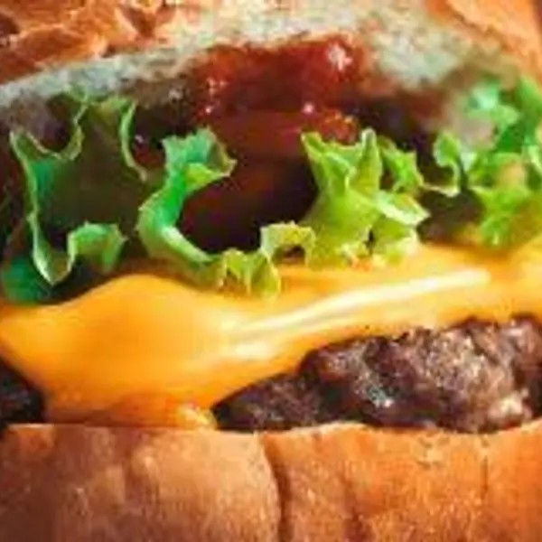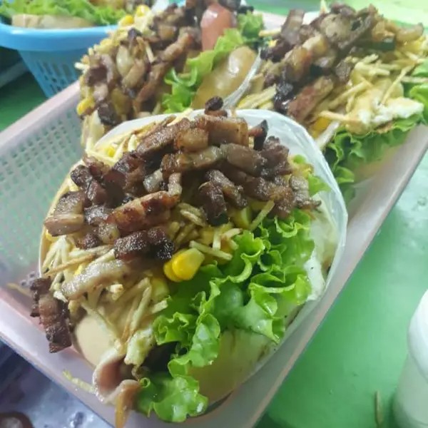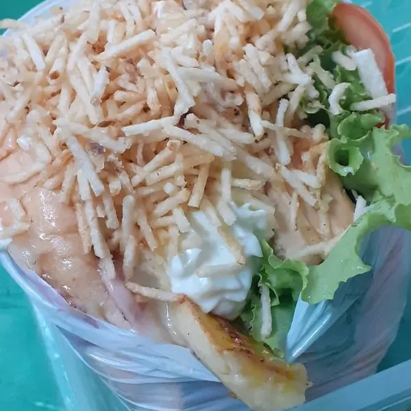 Pão bola, carne, queijo, alface, tomate, pepino, creme de repolho com maionese caseira, batata palha