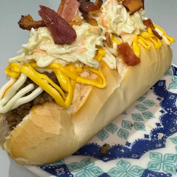 Pão careca especial, picadinho, salsicha com molho, creme de repolho com maionese caseira, cheddar, catupiry, bacon, batata palha