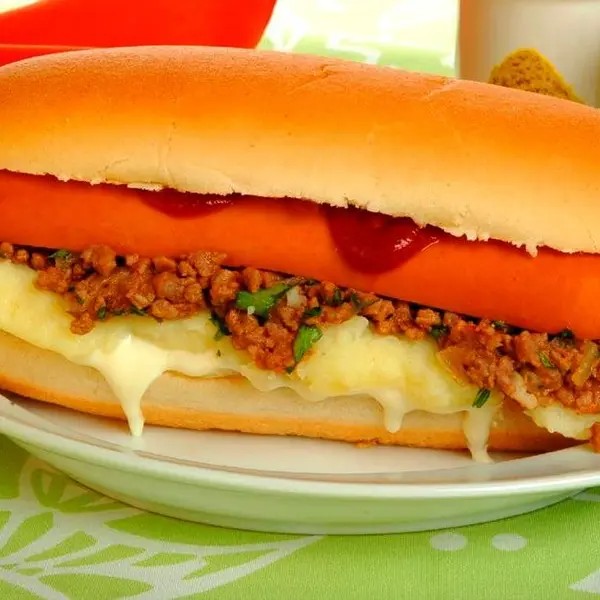 Pão de hot dog, picadinho, salsicha com molho, creme de repolho com maionese caseira, batata palha