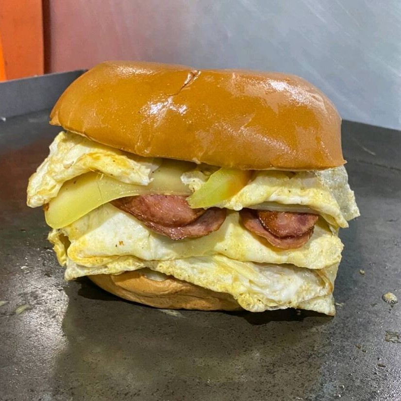 Pão, carne, ovo, queijo, tomate, pepino, milho, ervilha, alface, queijo ralado e batata palha, uma combinação perfeita de sabores.
