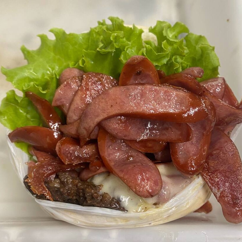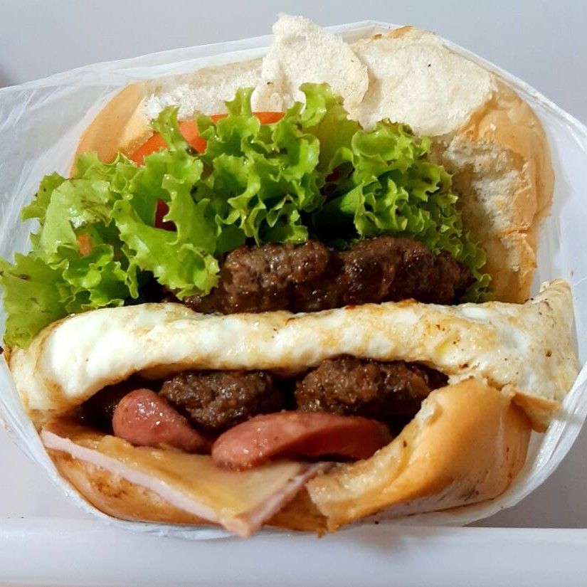 Pão bola, carne de hamburguer, ovo, calabresa, queijo, presunto, salada e batata palha.