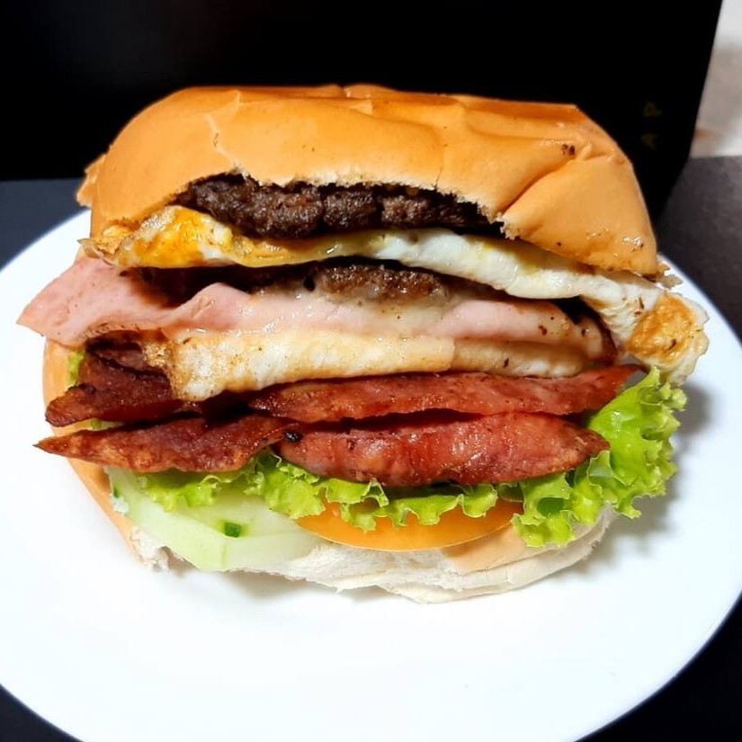 Pão bola, duas carnes de hamburguer, dois ovos, queijo, presunto, calabresa, salada e batata palha