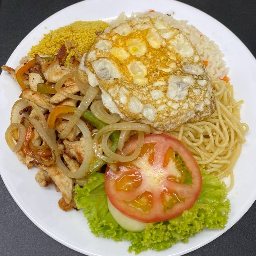 frango na chapa refogado com legumes, arroz, macarrão, farofa, salada e ovo frito.