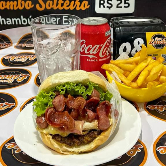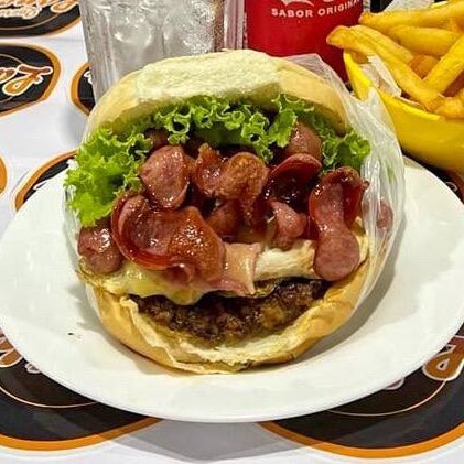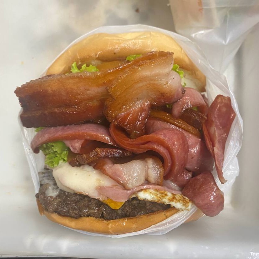 pão bola, duas carnes de 80g, ovo, calabresa, queijo e presunto, salada verde e batata palha