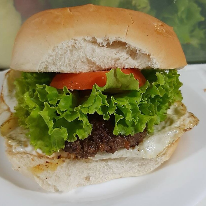 Pão bola, carne de hamburguer, ovo, salada e batata palha.