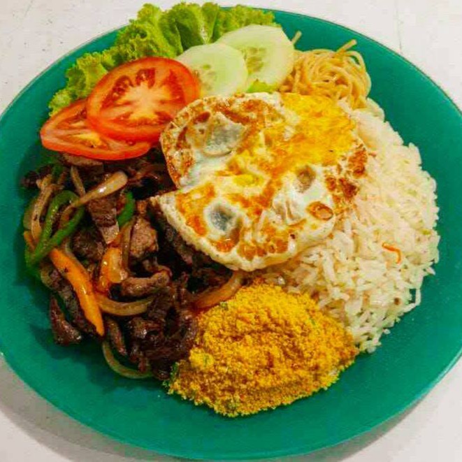 carne na chapa refogada com legumes, arroz, macarrão, farofa, salada verde e ovo frito