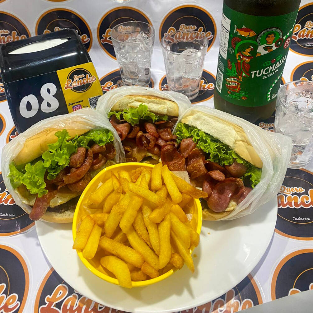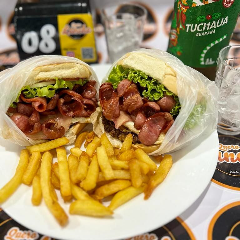 Pão bola, carne de hamburguer, queijo, presunto, calabresa, bacon, salada e batata palha.