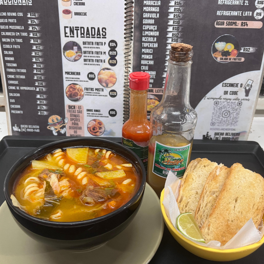 caldo de carne, massa e legumes, acompanha torradas e limão.