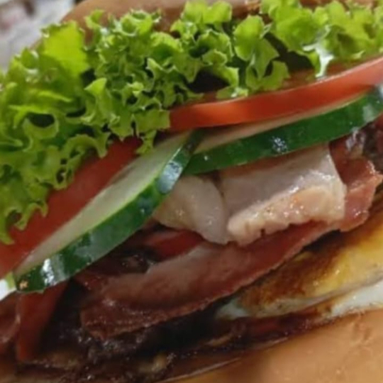 Pão bola, 2 carnes, 2 ovos, queijo, presunto, calabresa, salsicha, bacon, salada, batata palha, milho e ervilha.