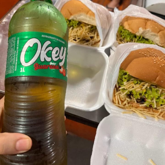 Pão bola, carne, calabresa, ovo, queijo, salada, batata palha, milho e ervilha.